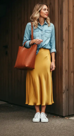A mustard satin skirt adds brightness and charm. Pair it with a light denim shirt for a playful balance. White sneakers offer comfort and keep the outfit grounded.