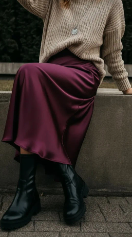 A plum satin skirt delivers rich color for the colder months. Go with a soft oatmeal sweater to keep it cozy. Black leather boots contrast nicely without clashing.