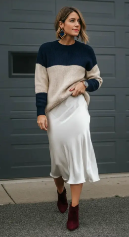 A white satin midi makes a perfect neutral base. Add a navy and cream color-block sweater for dimension. Burgundy ankle boots give a fresh pop of color.