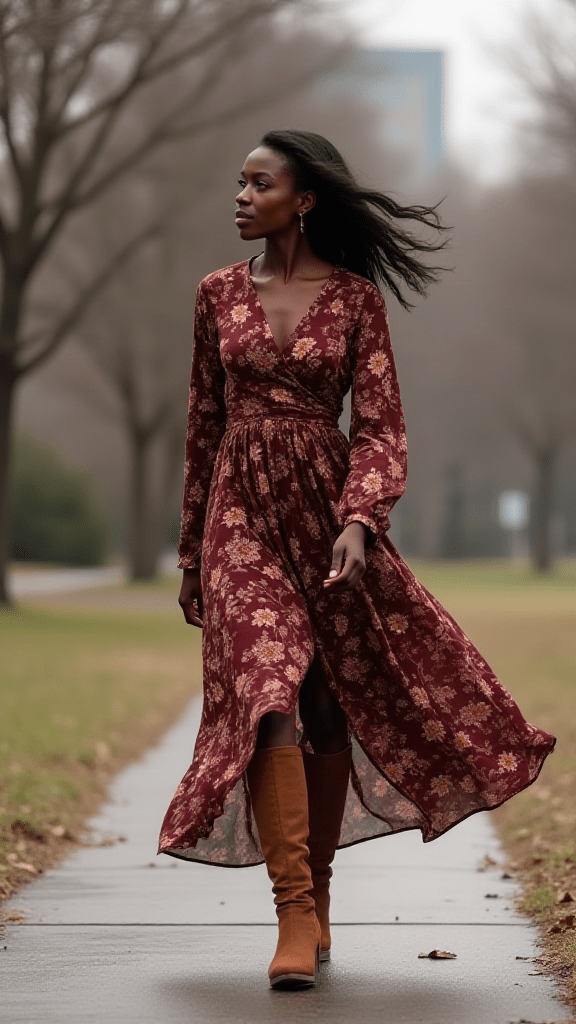 A printed maxi dress doesn’t have to stay in the spring section of your closet. Choosing a winter-inspired pattern gives it seasonal charm, especially when paired with knee-high boots that add height and structure. A statement hat or bold jewelry gives the outfit a creative twist. This look is great for days when you want something flowy and dramatic that still keeps you warm.