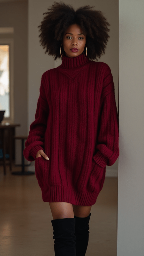 A sweater dress is the perfect blend of comfort and easy style in the winter. Choose a deep, rich color that highlights your skin and gives the outfit a warm, seasonal vibe. Thigh-high boots add a confident touch and keep the look feeling elevated. A few favorite accessories, like bold earrings or a textured bag, complete the outfit. This look is effortlessly cute for days when you want to stay warm but still feel dressed up.