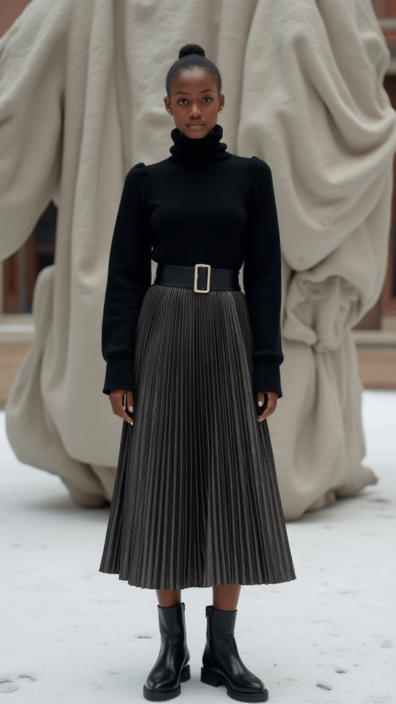 A fitted turtleneck tucked into a pleated midi skirt creates a timeless silhouette that works for so many occasions. The pleats add movement, and choosing a metallic or textured skirt makes the outfit feel modern. A belt at the waist defines your shape and adds a little extra detail. Stylish boots complete the outfit, giving it a polished, confident feel that fits right into any winter wardrobe.