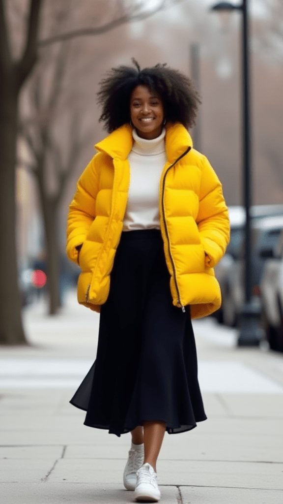 A bright puffer jacket brings instant energy to cold, gray days. The pop of color turns a practical winter piece into something fun, especially when worn with a flowing midi skirt that adds movement. Sneakers keep the look casual and easy to wear, while patterned tights or small accessories bring in personality. This outfit is perfect when you want something playful and stylish at the same time, making even the coldest days feel cheerful.