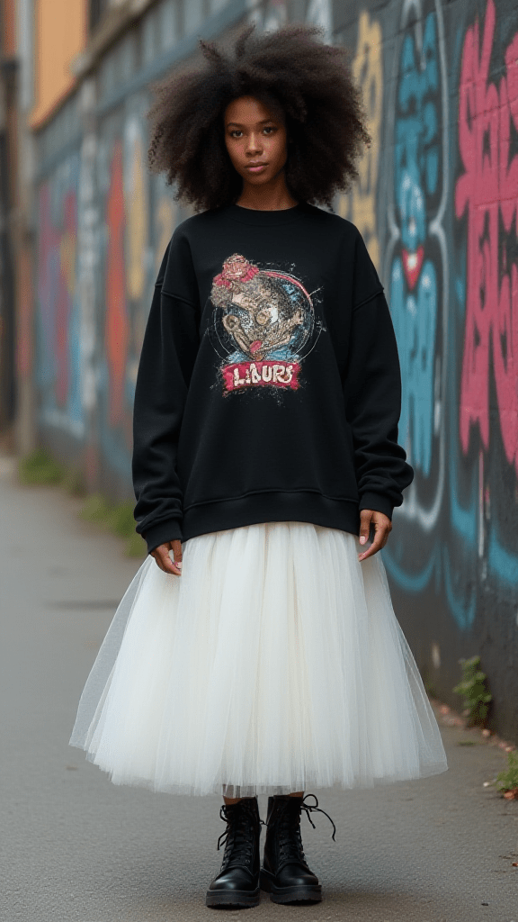A graphic sweatshirt paired with a tulle skirt creates a fun mix of casual and whimsical. The soft tulle adds volume and movement, while the sweatshirt keeps the look relaxed and easy to wear. Boots or sneakers work equally well, depending on your style. This outfit feels playful and expressive, perfect for days when you want something unique and creative.