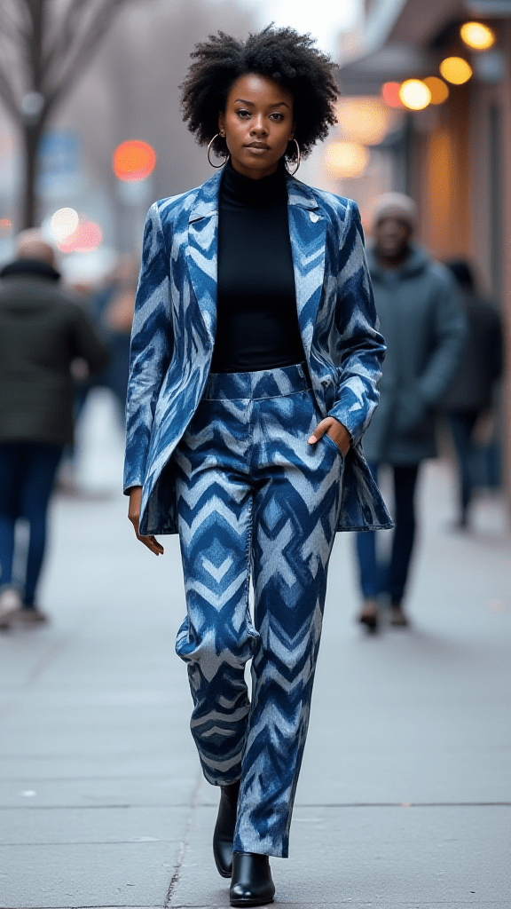A bold patterned pantsuit is a fun way to brighten the winter season. The matching set creates a long, clean line, while a turtleneck underneath adds warmth and depth. Choose accessories that match the mood — bold earrings or a strong lip can make the look stand out even more. This outfit blends personality with power, making it ideal for times when you want to look both creative and confident.