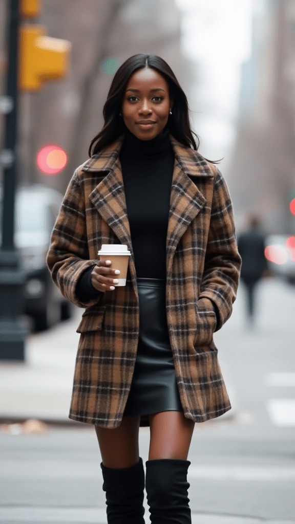Mixing a plaid blazer with a leather skirt gives you a look that’s classic with a trendy twist. The blazer adds structure, while the leather adds attitude, creating a balance that works for all kinds of occasions. A fitted top underneath keeps the layers neat. Add ankle boots to tie everything together. This outfit lets you play with contrast — a perfect mix of professional, fun, and bold without trying too hard.