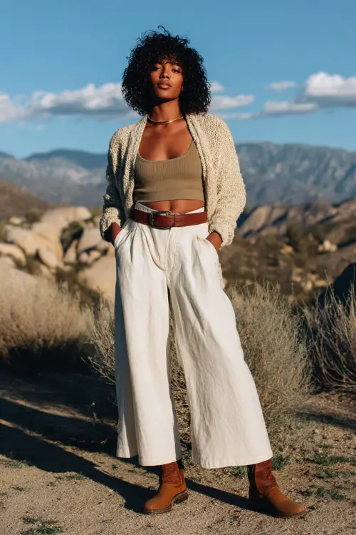 1. Relaxed Boho Neutrals with Wide-Leg Pants