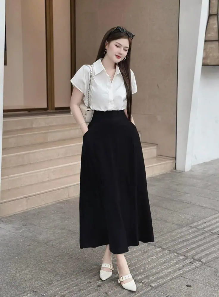 A black-and-white palette gives this outfit a timeless feel. The short-sleeve white blouse is light and breathable, while the black maxi skirt adds flow and grace. Pointed flats and small accessories pull it all together. This outfit is easy to style and perfect for a professional look that remains comfortable, ideal for busy school days or meetings.