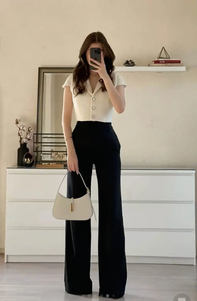 This outfit delivers timeless polish with a white button-down shirt tucked into black wide-leg pants. The tailored shirt and clean lines give a sharp appearance, while the pants add comfort and ease for all-day wear. Finished with a slim belt and a structured bag, it’s a look that communicates confidence and professionalism.