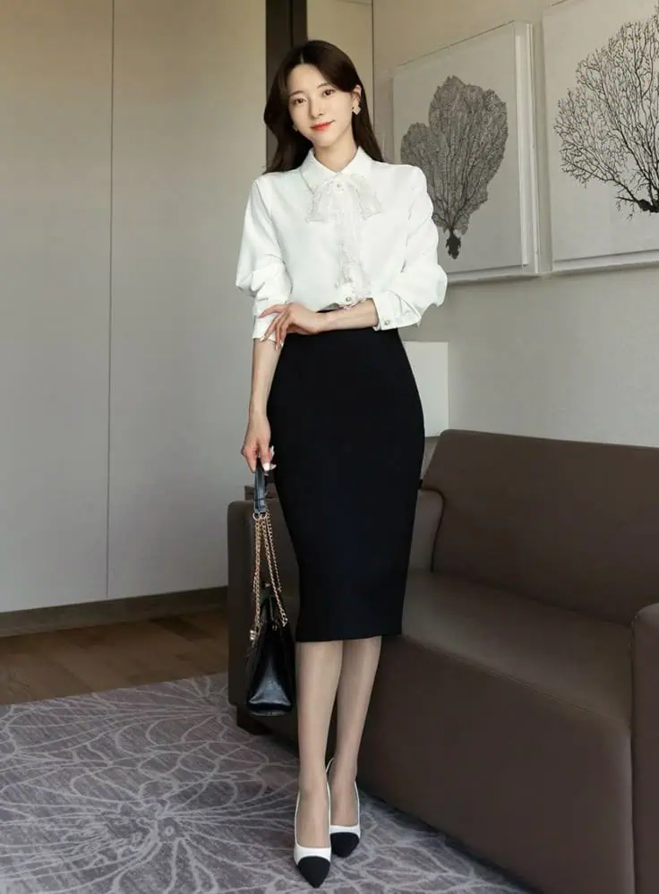 This black-and-white outfit features a ruffled blouse and classic pencil skirt. It balances structure with soft detail, giving off a confident but welcoming vibe. Two-tone shoes and a tailored bag pull it all together, making it an outfit that feels both functional and elegant.