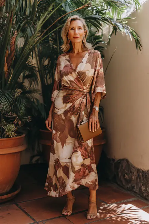 For sunny dinners or weekend getaways, a wrap-style midi dress with tropical prints is my favorite. The waist tie flatters my figure, and the short sleeves let me stay cool. I like to finish it with simple sandals, a structured clutch, and understated earrings to balance the playful print with a grounded, elegant touch.