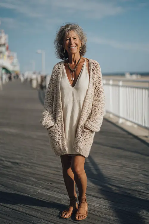 On days near the beach or walking along the boardwalk, layering a lightweight knit cardigan over a mini dress is my go-to. The cardigan adds cozy texture without overheating, and the mini dress keeps the outfit fresh. Strappy sandals and layered necklaces bring a soft boho charm, making it effortless yet stylish.