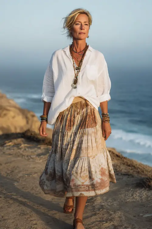 One of my favorite combinations is a loose white button-up shirt with a tiered printed midi skirt. It moves beautifully and feels elegant without trying too hard. Layering delicate necklaces, stacking a few bracelets, and wearing flat sandals keeps the outfit stylish, classic, and effortlessly boho.