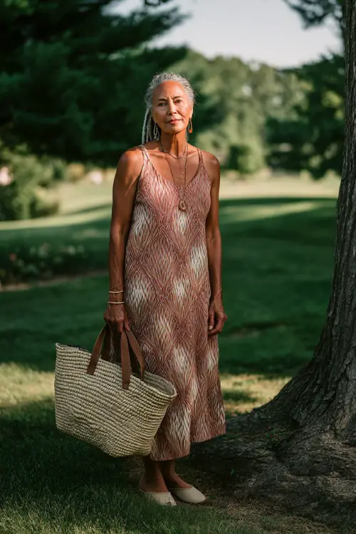 For picnics or casual outdoor events, I love a sleeveless midi dress in soft prints. Its relaxed cut keeps me comfortable, while neutral flats, a woven tote, and minimal jewelry make the outfit look effortless and chic without any extra fuss.