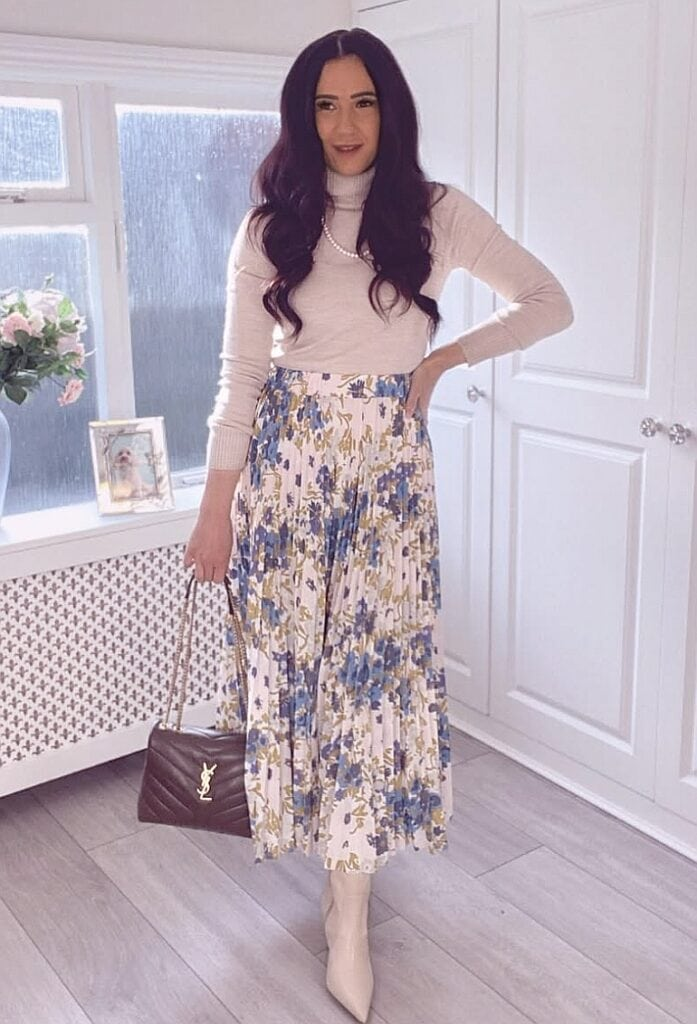Florals are not just for warmer months and can look beautiful in winter. A pleated midi skirt with soft floral details adds elegance to a holiday outfit. It feels unexpected but still seasonal.