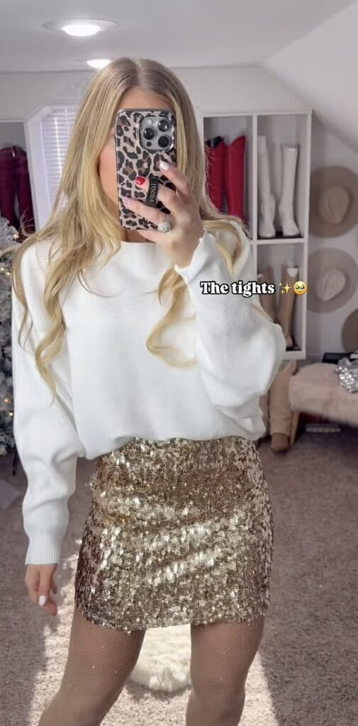 A soft white sweater keeps the outfit cozy and balanced. Fishnet tights add texture and make the look feel complete for a festive evening.