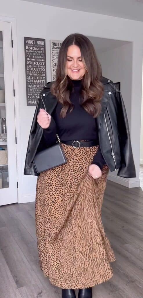 Leopard print adds personality while still feeling neutral. A flowing skirt creates movement and softness. It balances well with structured pieces.