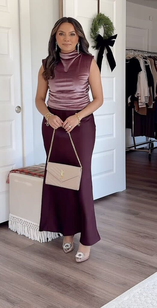Layering different fabrics creates interest. A velvet top adds richness. A pleated skirt keeps the outfit light.