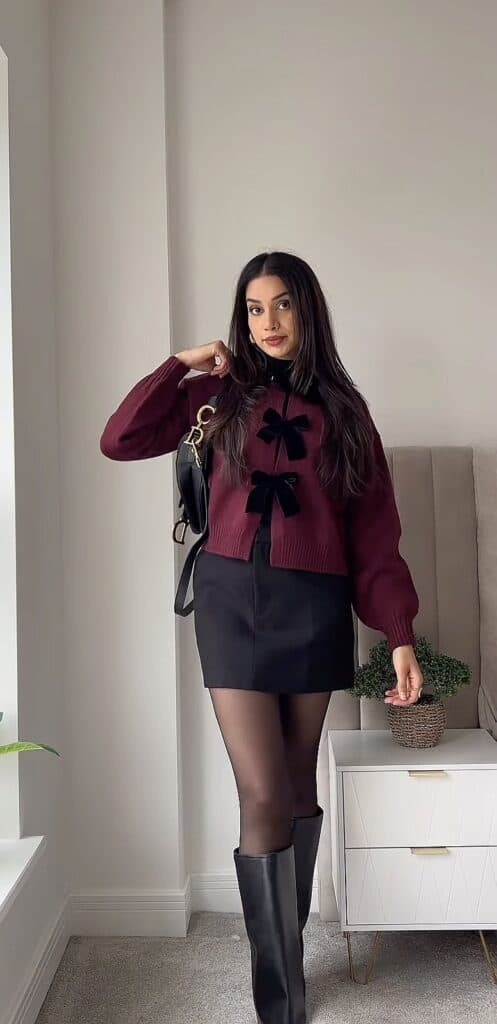 Burgundy feels rich and perfect for winter. A cropped cardigan layered over a fitted top creates a flattering shape. Small bow details add charm.