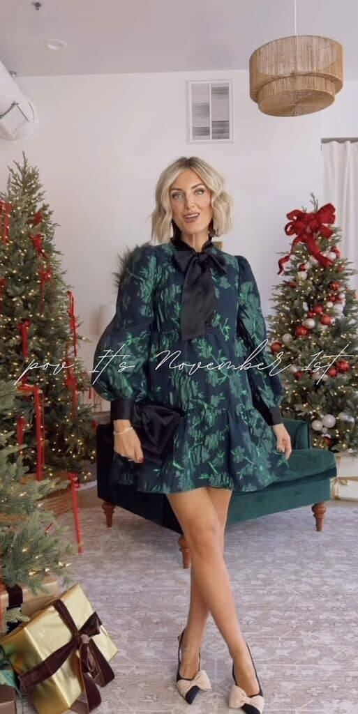 A patterned green dress feels festive and bold. Puffy sleeves add shape and interest. A black bow detail keeps it polished.