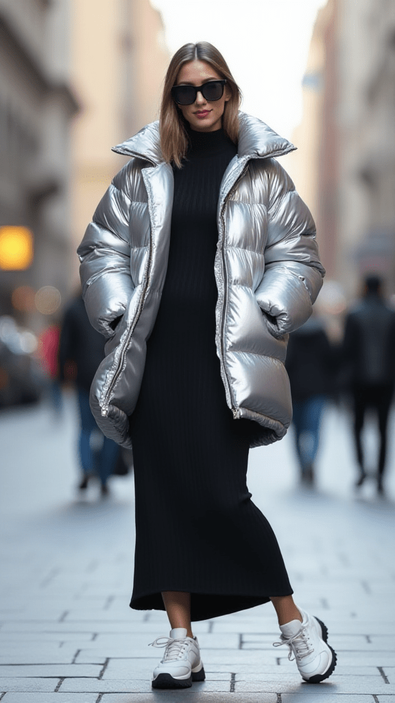 Yes, puffer coats can look fashionable too. Choose one in a metallic shade or bold color to pair with a fitted midi dress, creating a striking contrast between sporty and sleek. Add chunky sneakers or heeled boots to round out this modern street-style combo. This is one of those Warm Winter Outfits that makes you feel put together even on the coldest days. Opt for a belted puffer to define your waist and enhance your silhouette.