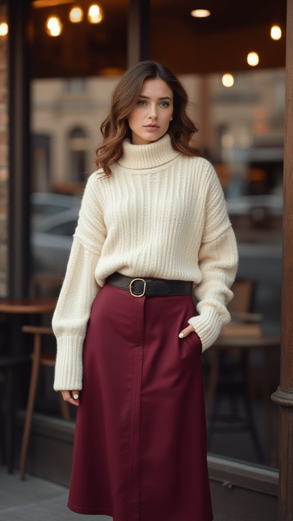 This pairing is all about balance — a chunky turtleneck on top and a flowy midi skirt below. Together, they create an elegant, feminine shape that’s warm and flattering. Add a belt to define your waist and tall boots for a polished touch. Experiment with texture by pairing a wool sweater with a satin or pleated skirt for Warm Winter Outfits that feel both classic and fresh.