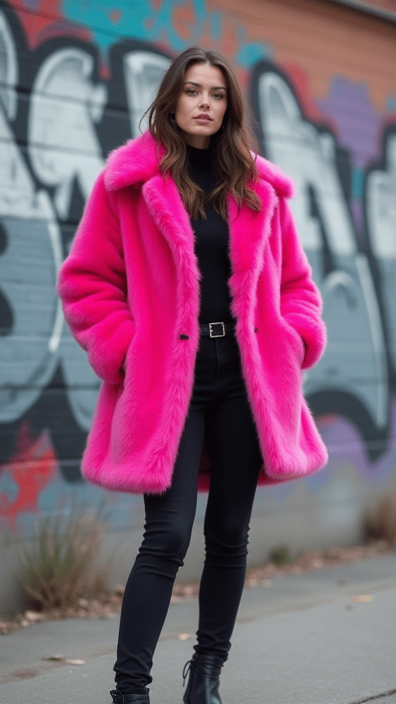 Inject color into your cold-weather wardrobe with a bold faux fur coat. Go for eye-catching shades like pink, teal, or mustard to brighten gray winter days. Keep the rest of your outfit simple — a black turtleneck and jeans work perfectly. Among Warm Winter Outfits, this look is a statement-maker that turns comfort into pure glam. It’s playful, cozy, and perfect for standing out in a sea of neutrals.