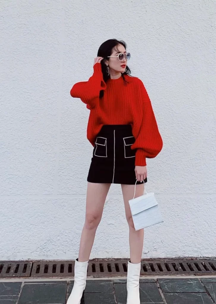 This outfit pairs a bold red sweater with a black mini skirt for a sharp contrast. The look feels modern and stylish without being too loud.