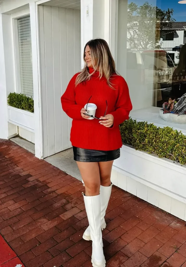 A red sweater styled with a black leather skirt and knee-high boots looks bold and confident. The outfit feels strong and stylish.