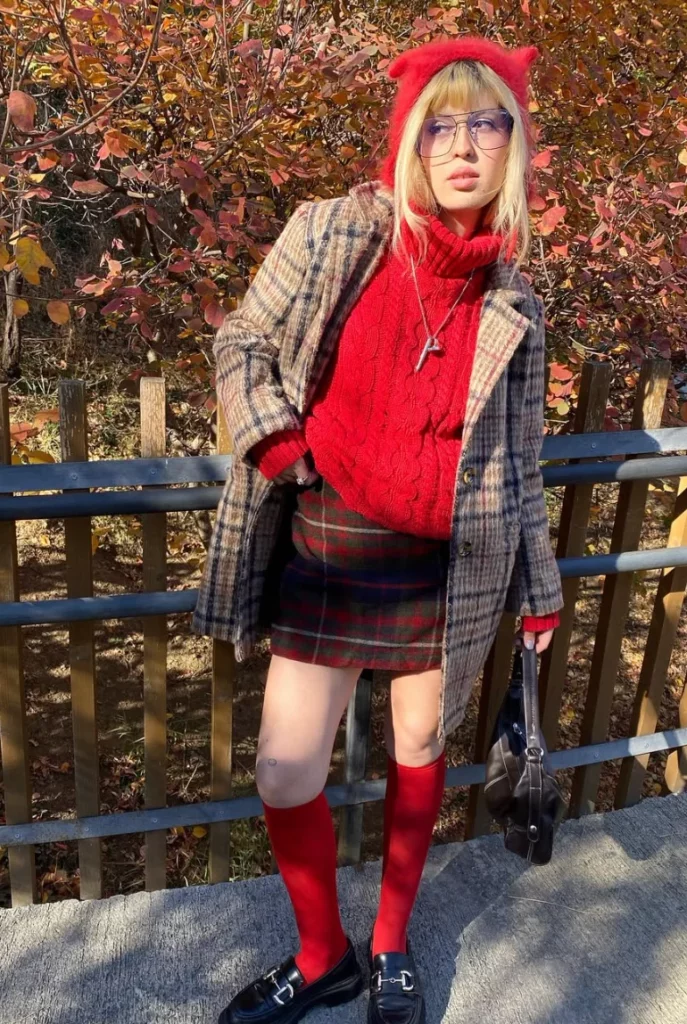 A red cable-knit sweater paired with a plaid skirt feels warm and playful. The layered textures make the outfit more interesting.