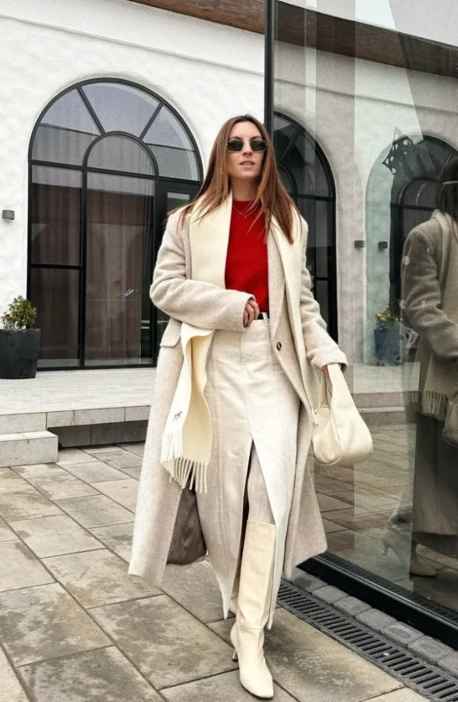 A red sweater paired with a long cream coat creates a clean winter look. White boots complete the soft color palette.