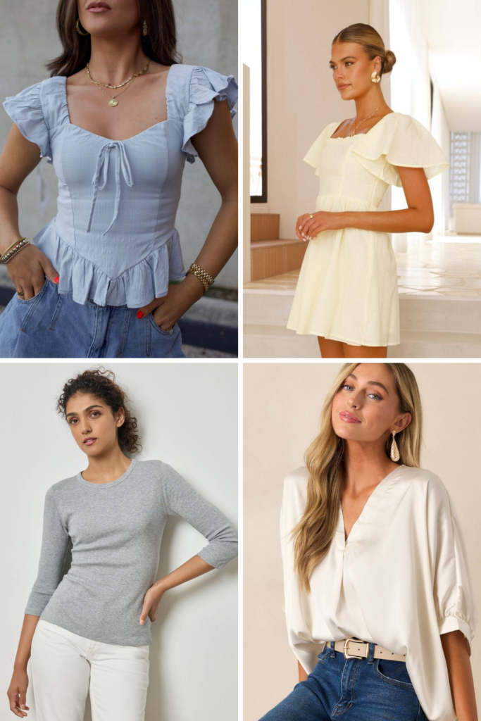 A: Look for sleeves that skim instead of squeeze, like flutter, dolman, ¾ length, or flowy short sleeves. Avoid tight cap sleeves that end at the widest part of your upper arm.