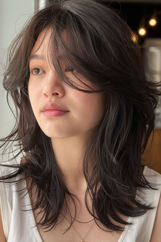 When I want a softer look, I go for curtain bangs with a wolf cut. They frame the face gently and blend well into the layers.