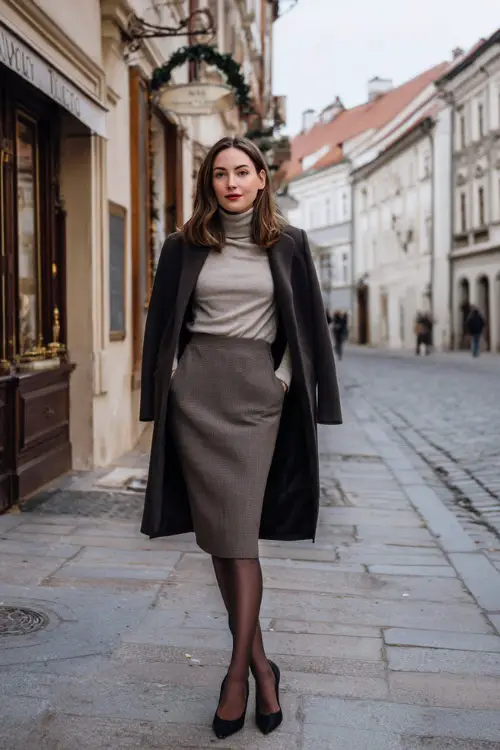 Bottoms play a major role in grounding Winter Jacket Outfits. Midi skirts, pleated skirts, pencil skirts, and tailored trousers add instant refinement and help balance structured outerwear. Length and proportion should feel deliberate and flattering, never accidental. Mini skirts can still fit this style when paired with tights and classic footwear to preserve elegance and practicality during colder months.