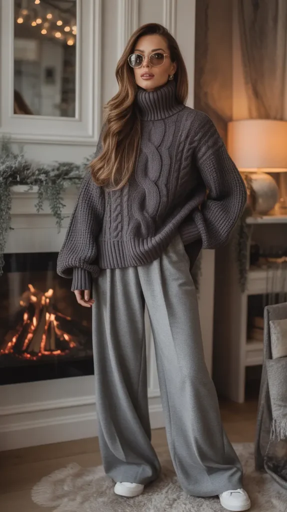 This paragraph describes a monochrome gray outfit that feels polished and cozy at the same time. Layered knits add visual depth while keeping the look cohesive.