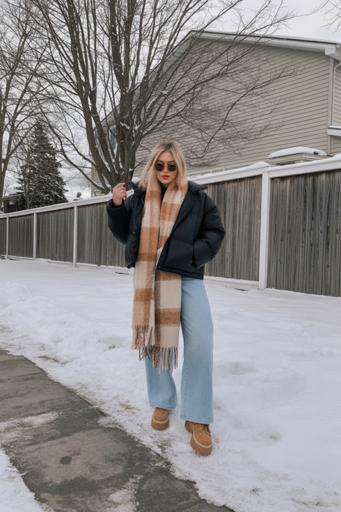 This outfit balances warmth and style effortlessly. A thick puffer jacket with a long plaid scarf prepares you for winter’s chill. Earth tones paired with light-wash jeans and caramel boots create a cozy but wearable look.