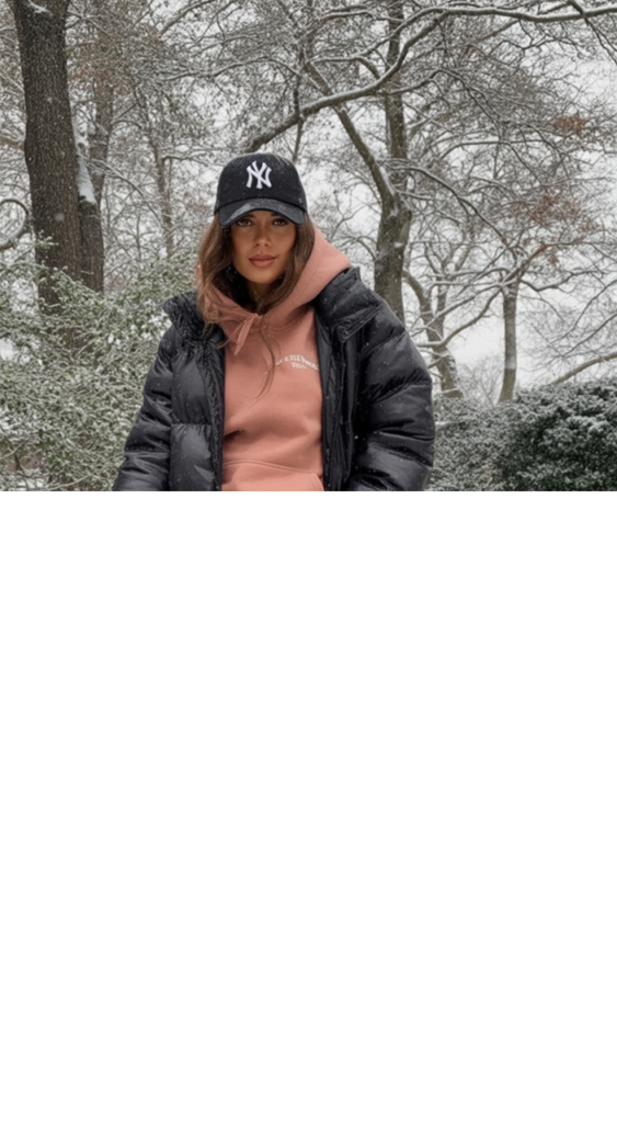 If you like sporty and trendy, this outfit is for you. A rose-colored sweatshirt set under a black puffer jacket brings a bold, grungy vibe. Add a baseball cap and chunky boots for casual yet stylish winter wear.