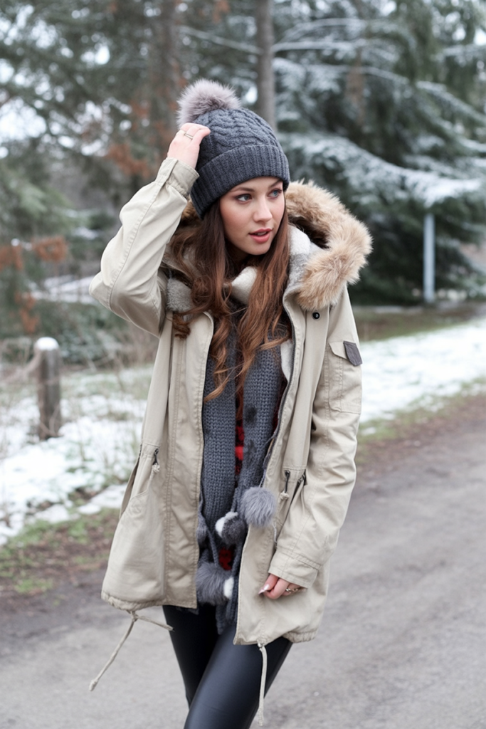 A fur-lined parka with bulky knits and leather leggings offers warmth and style. A pom-pom beanie adds playfulness, balancing utility with fashion.