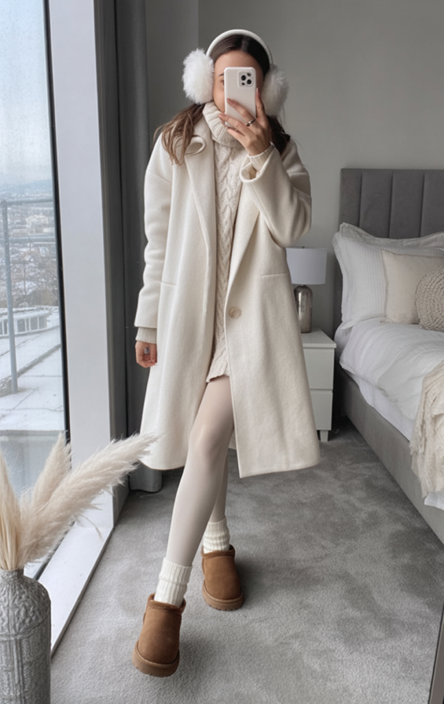 Ivory tights and a white wool coat paired with warm boots create a classic and sophisticated winter look. Ear muffs add a playful element.