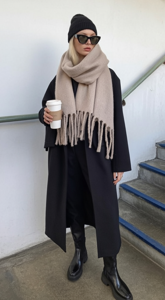 A structured coat with a chunky beige scarf makes a strong Scandinavian fashion statement. Chelsea boots and bold sunglasses finish the look.