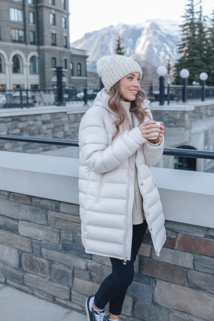 A cream puffer combined with knit pieces creates a soft and stylish winter look. Leggings and classic sneakers keep it casual and comfy.