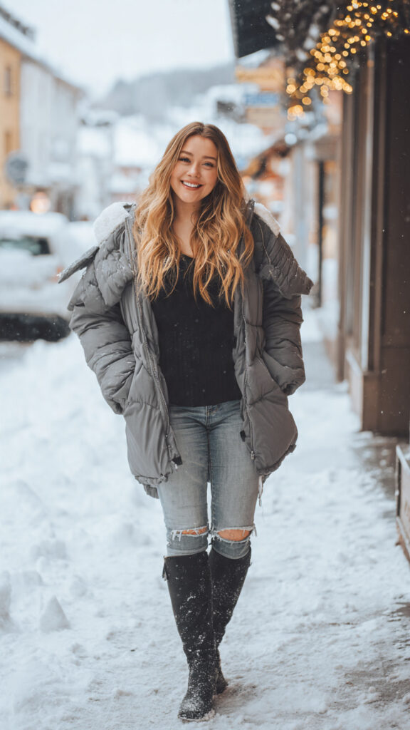 1. Curvy Puffer Jacket + Skinny Jeans + Knee-High Boots