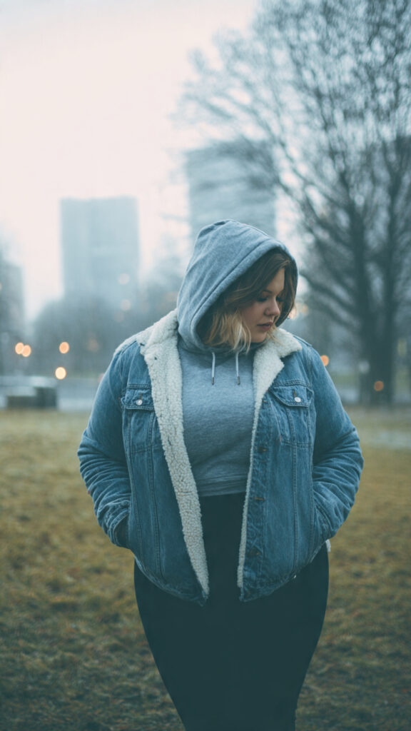 11. Sherpa-Lined Denim Jacket + Hoodie + Black Leggings
