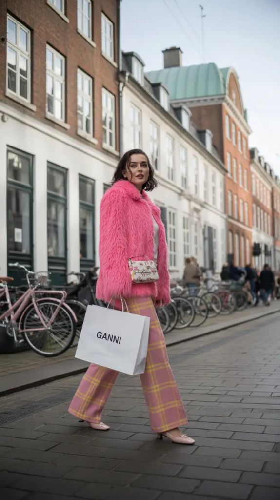 Winter does not have to be gray, and this look proves it clearly. A bright pink faux fur coat paired with soft pink plaid trousers brings warmth through color rather than heaviness. The shape feels vintage-inspired with a modern edge, making the outfit playful but still structured.