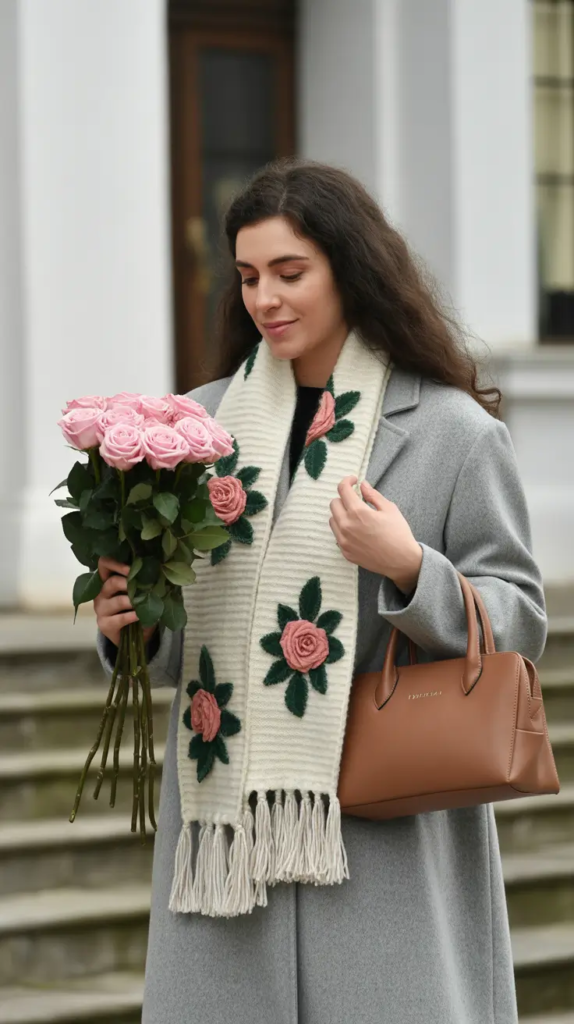 This outfit feels calm, romantic, and deeply comforting. A gray wool coat paired with a cream scarf featuring soft floral details brings a gentle, almost nostalgic winter mood. The look feels quiet but meaningful, focusing on softness rather than bold statements.