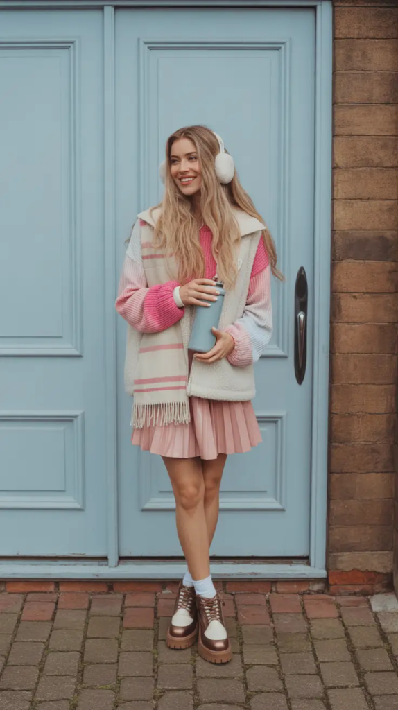 Soft layers and gentle colors create a warm and inviting winter look. A pleated blush dress paired with an oversized striped sweater and quilted vest feels cozy without losing shape. Accessories like scarves and earmuffs complete the softness.