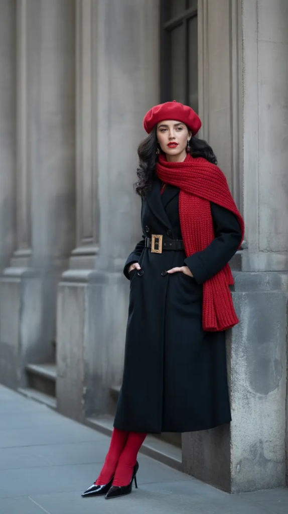 Bold contrast defines this striking winter look. A black wool coat paired with red accessories creates drama without feeling excessive. The red scarf, beret, and tights bring strong energy and confidence.