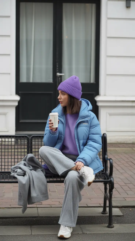 Soft blues and lavender tones bring calm to winter dressing. A powder blue puffer layered over a lilac set feels relaxed and dreamy. Corduroy jeans add texture and warmth.