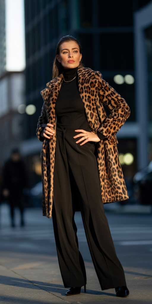 Leopard print takes center stage in this outfit and becomes the main focus. A leopard-print coat adds bold energy without feeling overwhelming.