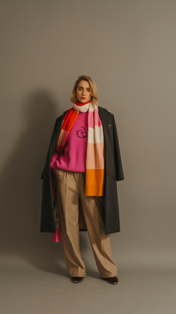 This outfit steps away from traditional winter neutrals. Bright knitwear paired with a contrasting scarf adds visual interest.